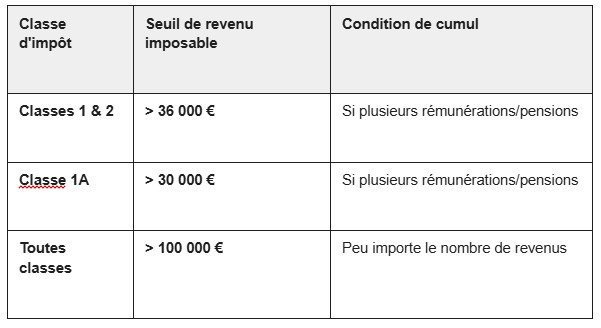- Cumul de rémunérations > 36 000 € (Classe 1) ou > 30 000 € (Classe 1A).
